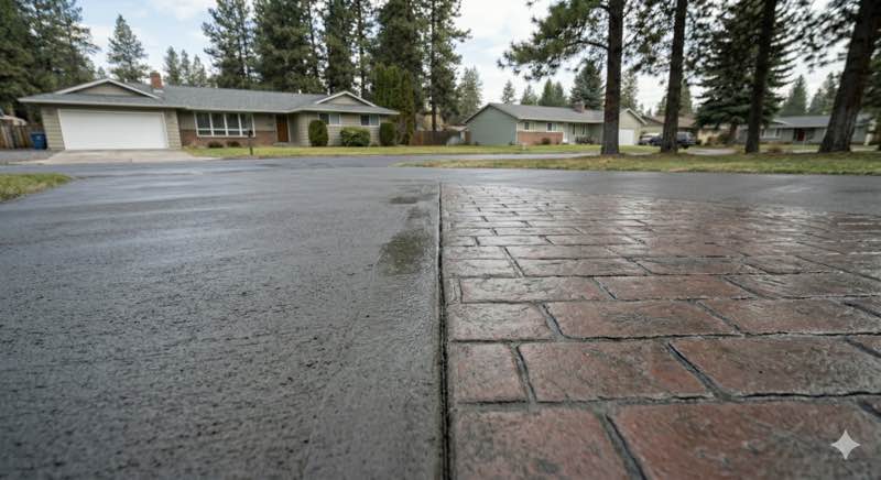 Driveway size and shape. This one's obvious but worth saying clearly. A 400-square-foot driveway and an 800-square-foot driveway aren't just different in size. They're different in material volume, labor hours, and prep time. Odd shapes matter too. L-shaped driveways or ones that curve around a garage take more effort to form and finish than a simple rectangle. We see this a lot in Spokane Valley neighborhoods like Greenacres and Ponderosa, where homes built in the 1970s and 1980s often have wider, angled driveways that add complexity.